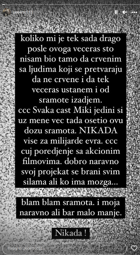 – Koliko mi j tek sad drago što poslije ovoga sinoć što nisam tamo da crvenim sa ljudima koji se prave da ne crvene, i da tek večeras ustanem i od sramote i izađem. Svaka čast, Miki, jedini i uz mene tada osetio ovu dozu sramote. Nikada više u “Zadrugu”, ni za milijarde evra! Čuj, poređenje sa akcionim filovima! Dobro, projekat se brani svim silama, ali ko ima mozga… Blam, blam i sramota! I moja, ali bar malo manje. Nikada – napisao je revoltirano učesnik koji je takođe imao ispade.